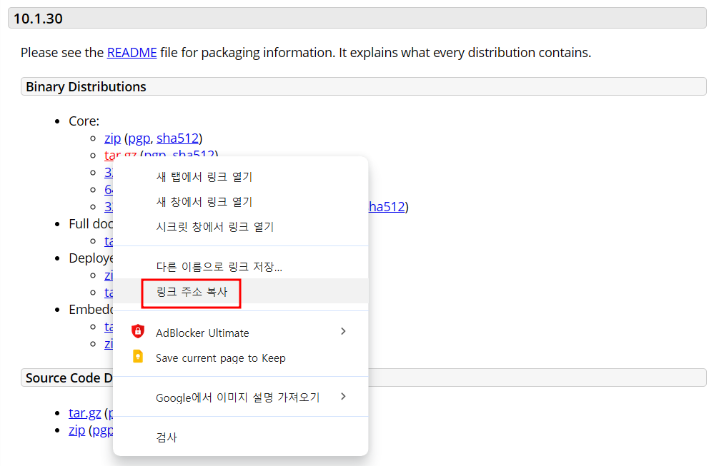 설치하고자 하는 Tomcat 버전의 tar.gz에서 오른쪽 클릭으로 링크 주소 복사를 해주자.