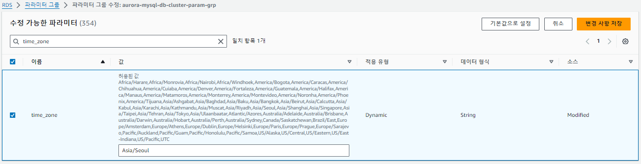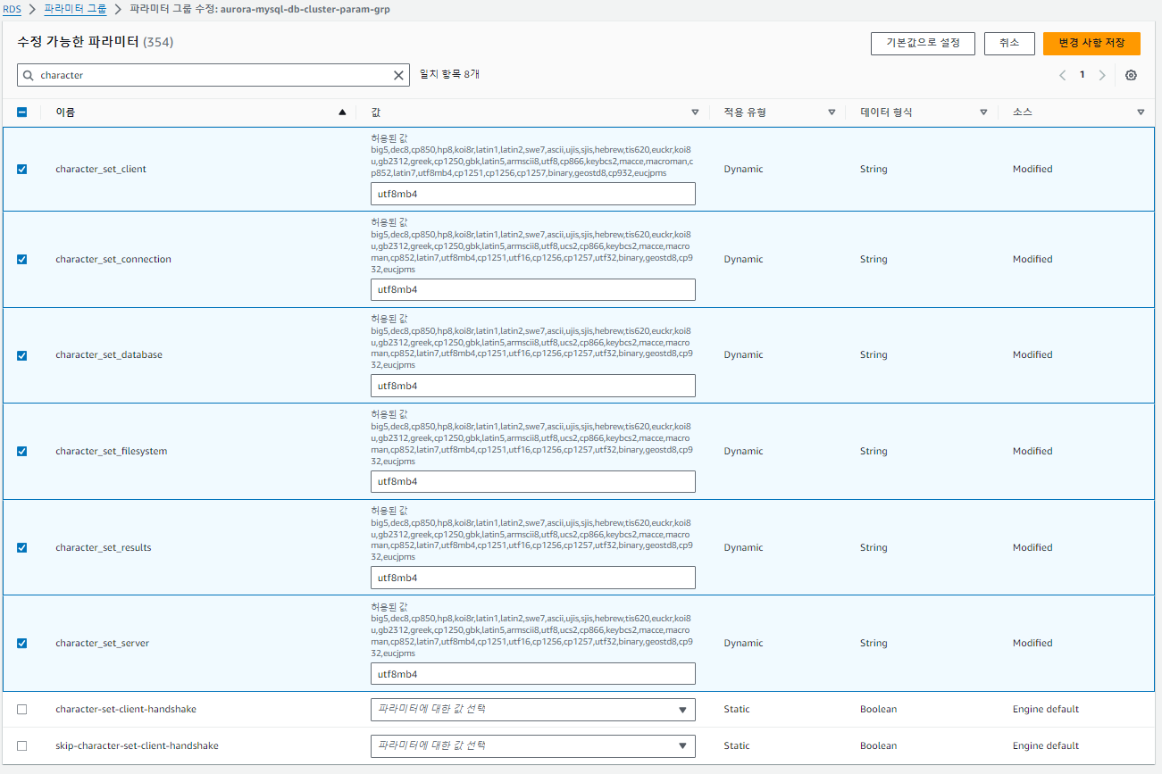 - 파라미터 그룹 2개 생성(DB 클러스터, DB)