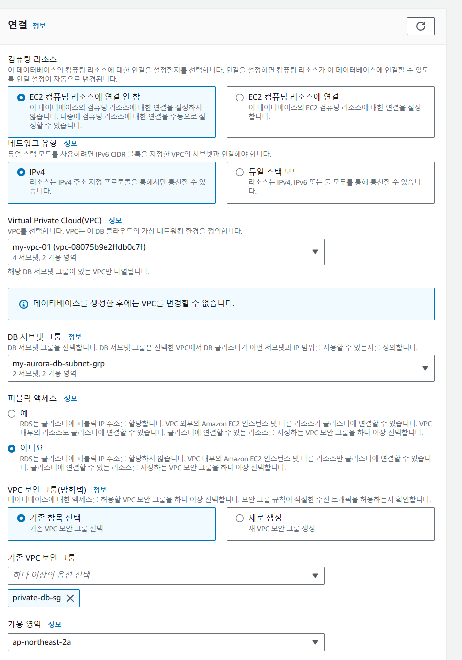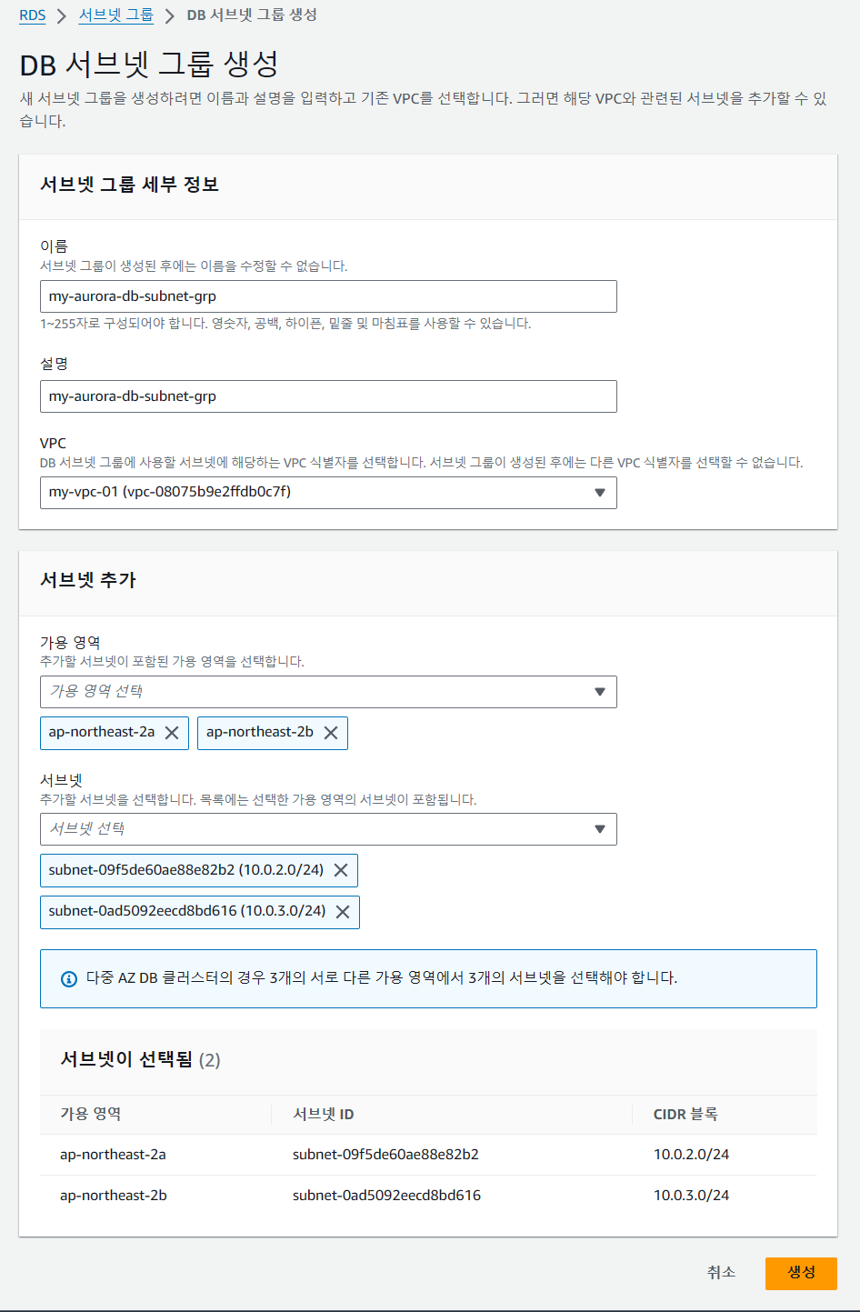 Private Subnet(my-private-db-subnet-2a, my-private-db-subnet-2b) 2개를 선택해 줬다.