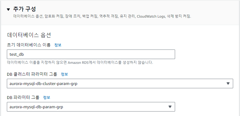 DB 클러스터 파라미터 그룹, DB 파라미터 그룹은 위에서 미리 생성해 둔 것을 사용하자.