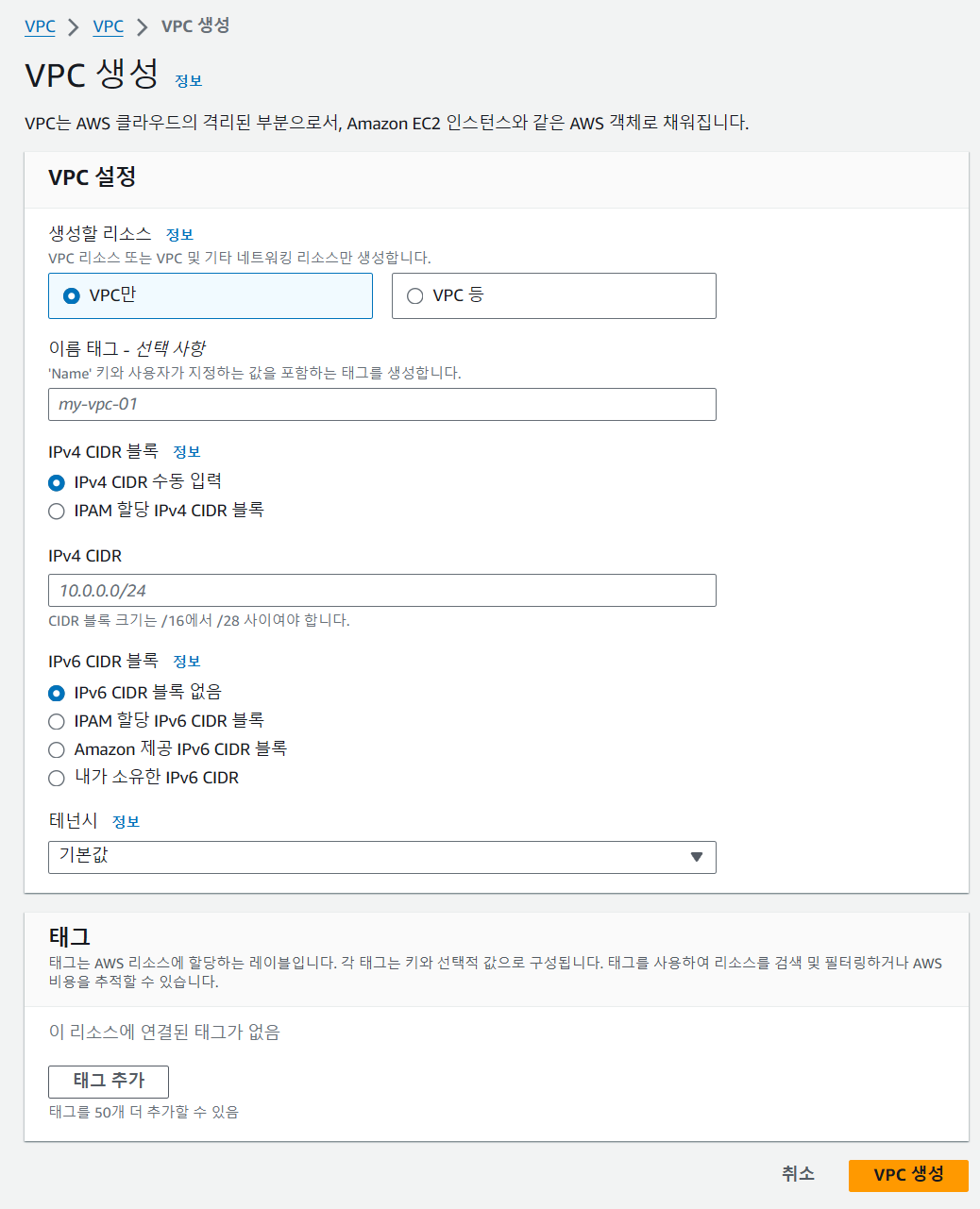 참고로 한 리전 안에 VPC를 여러 개 생성할 때 서로 IP는 겹치면 안 된다.