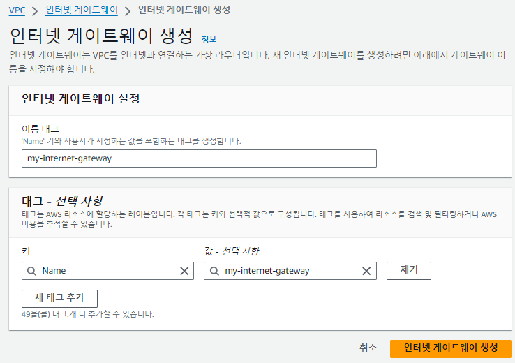 VPC 대시보드 > 인터넷 게이트웨이 > '인터넷 게이트웨이 생성' 클릭