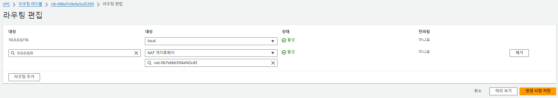 VPC 대시보드 > 라우팅 테이블 > Private Subnet(my-private-subnet-rt) > 하단 '라우팅' 탭 > '라우팅 편집' 클릭
