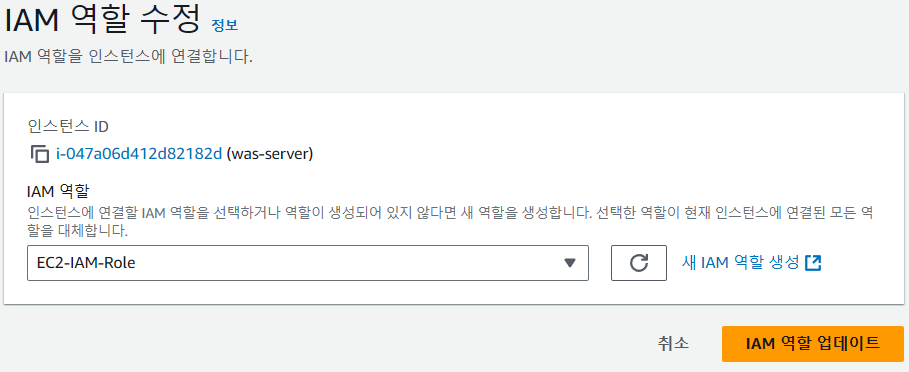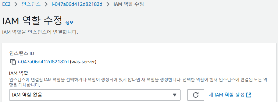 그 후, 다시 EC2 IAM 역할 수정화면으로 돌아와 새로고침을 하면 생성한 역할이 셀렉트박스에 값으로 추가되는데