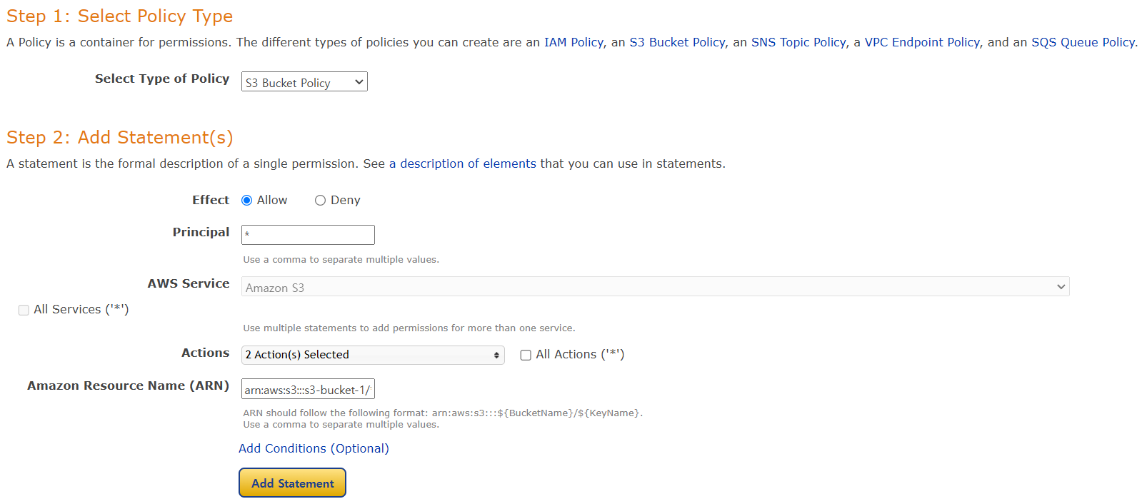 Add Statement > Step 3: Generate Policy 하단에 'Generate Policy' 클릭
