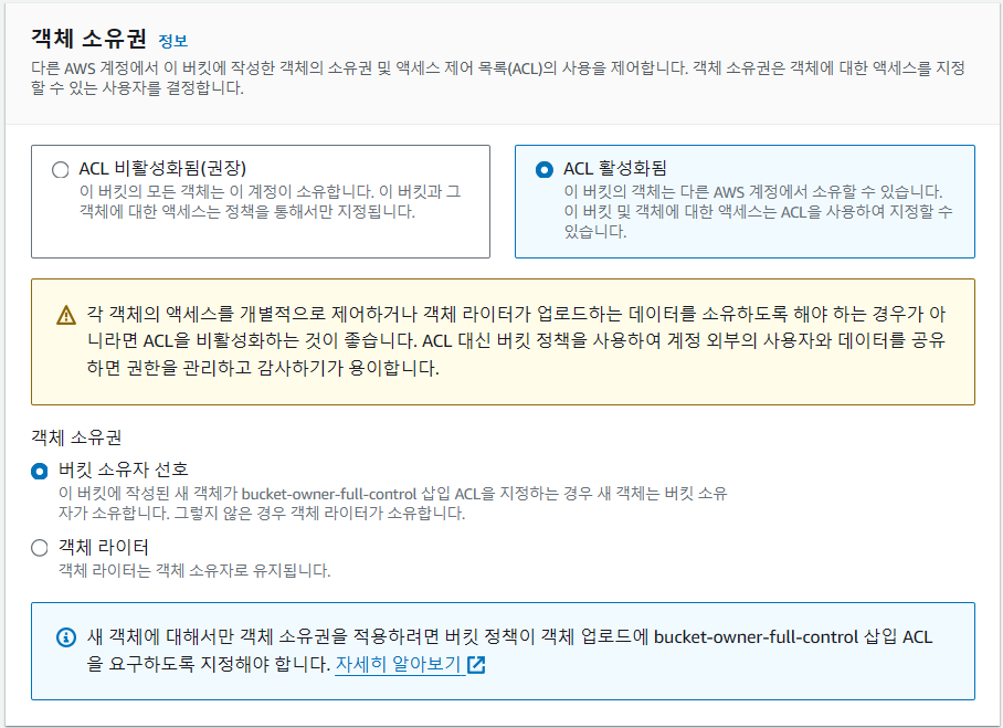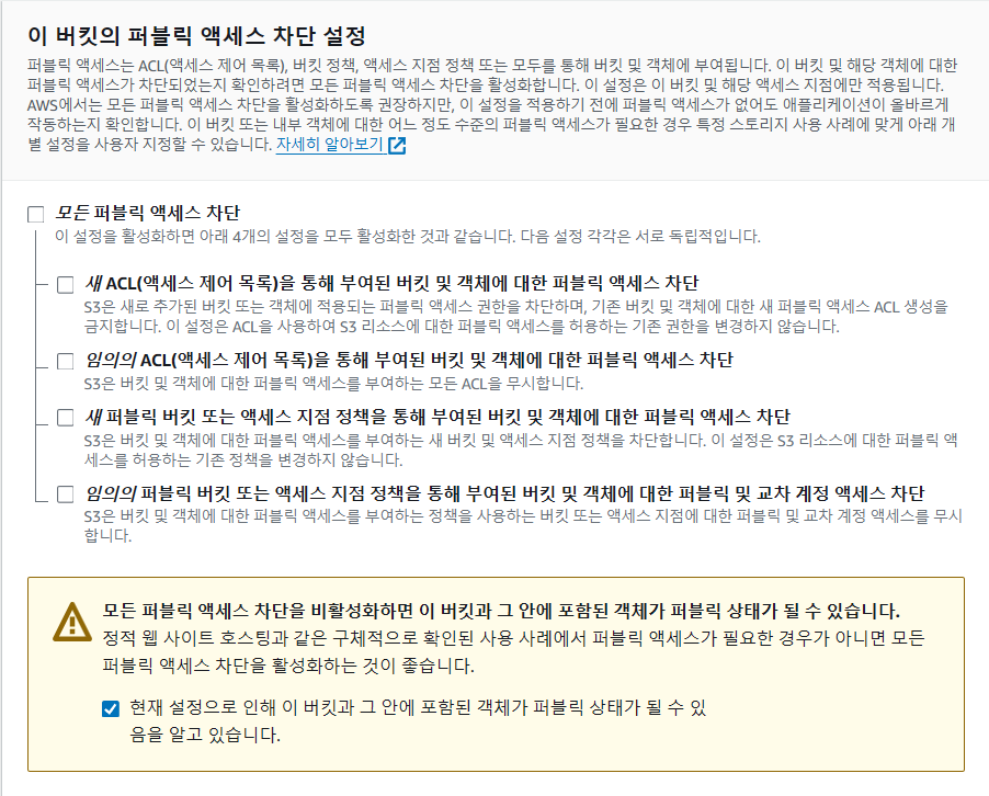 위와 같이 세팅 후 나머지 설정은 전부 기본값 놔두고 '버킷 만들기'